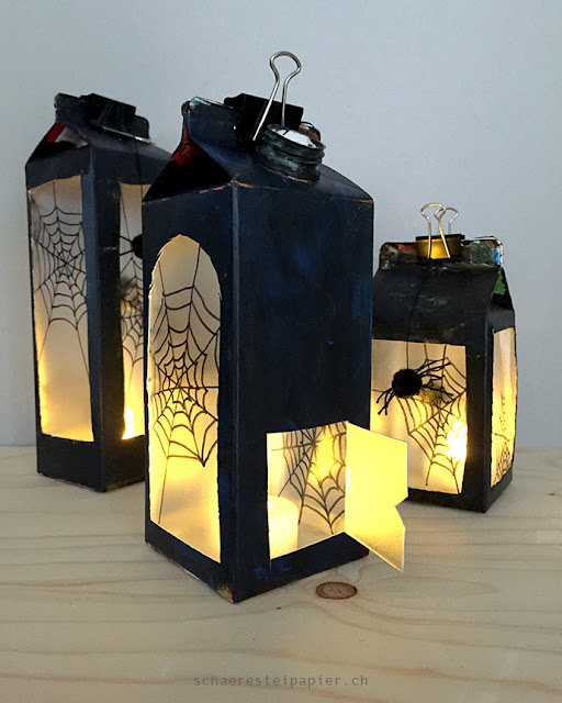 Latarnie na Halloween wykonane z opakowania po mleku. Zdjęcie i instrukcja pochodzi ze strony schaeresteipapier.